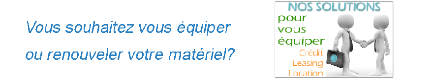 Une vente directe, nous achetons directement aux fabricants, importons si nécessaire et vous livrons. Besoin d'un devis? Faites votre demande depuis ce site ou en nous envoyant un courriel. Une proposition en LOA pourra vous être faite si vous souhaitez financer ces équipements. Nous assurons le SAV et l'installation si nécessaire.